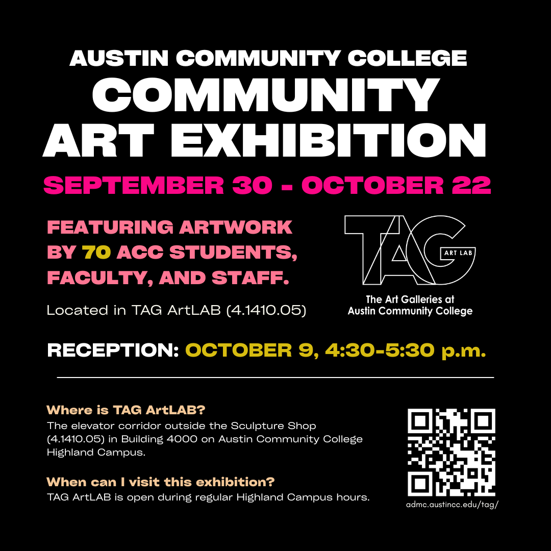 This exhibition is juried by Austin-based artist Brian Joseph and will be held in TAG Art Lab (Building 4000, ACC Highland Campus).