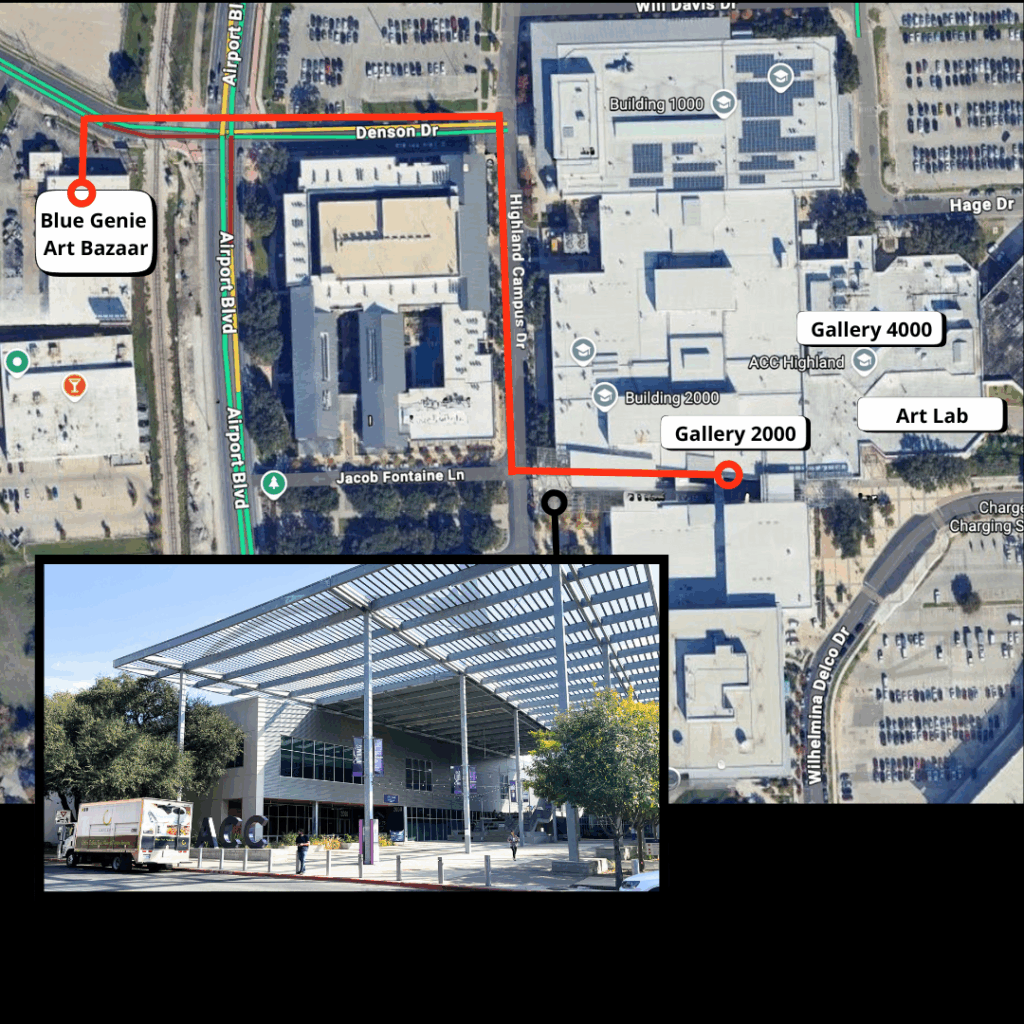 If you are visiting us on the train, our galleries are located on the Red Line at the Highland stop. Once you are at the station, make your way east across Airport Blvd and onto ACC Highland Campus. The Art Galleries at ACC are located in Building 2000 and 4000.
